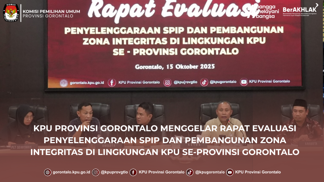 Gorontalo - KPU Provinsi Gorontalo menggelar Rapat Evaluasi Penyelenggaraan Sistem Pengendalian Intern Pemerintah (SPIP) dan Pembangunan Zona Integritas (ZI) di lingkungan KPU se-Provinsi Gorontalo. Kegiatan ini dilaksanakan secara daring di Aula KPU Provinsi Gorontalo pada Rabu (15/10/2025).