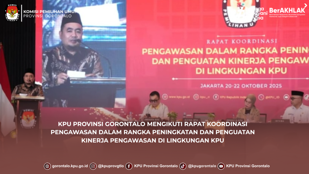 Gorontalo - Anggota KPU Provinsi Gorontalo Kadiv Hukum dan Pengawasan Risan Pakaya, dan Plt. Sekretaris KPU Provinsi Gorontalo, Marleni Makuta, mengikuti Rapat Koordinasi Pengawasan dalam Rangka Peningkatan dan Penguatan Kinerja Pengawasan di Lingkungan KPU. Kegiatan berlangsung di Jakarta pada Senin-Rabu (20-22/10/2025).