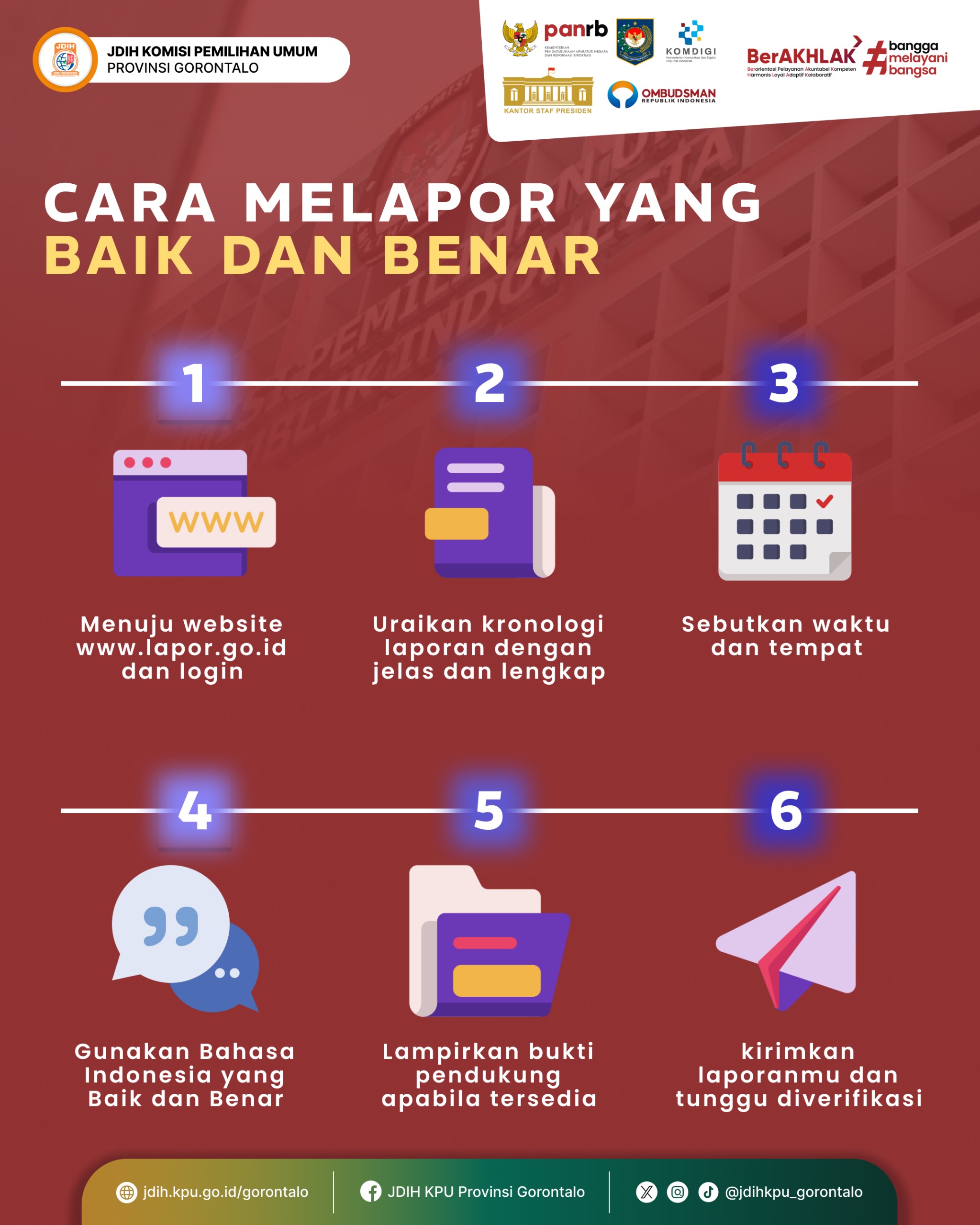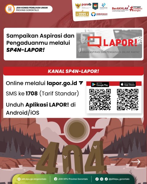 Komisi Pemilihan Umum Provinsi Gorontalo mengajak masyarakat untuk memanfaatkan saluran resmi yang telah disediakan. Sampaikan Aspirasi dan Pengaduanmu melalui SP4N-LAPOR!