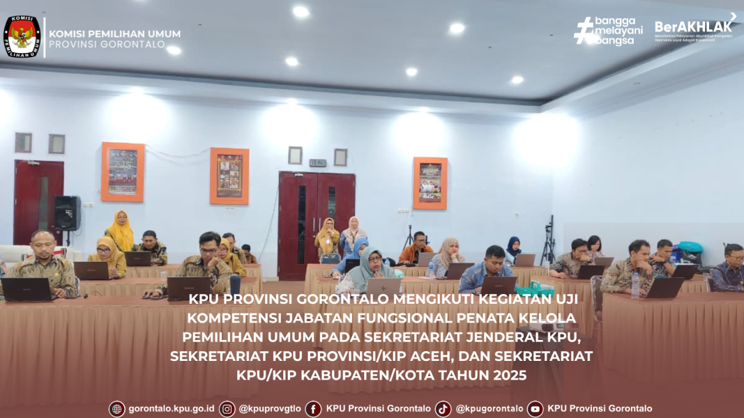 Gorontalo - KPU Provinsi Gorontalo mengikuti kegiatan Uji Kompetensi Jabatan Fungsional Penata Kelola Pemilihan Umum pada Sekretariat Jenderal KPU, Sekretariat KPU Provinsi/KIP Aceh, dan Sekretariat KPU/KIP Kabupaten/Kota Tahun 2025 yang berlangsung di Aula KPU Kota Gorontalo pada Jumat (31/10/2025).