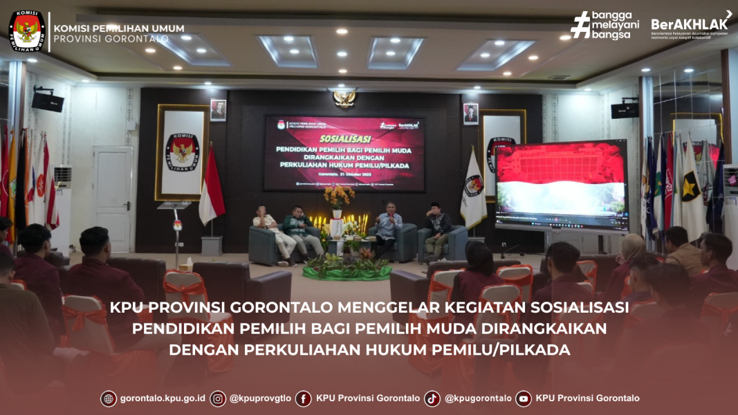 Gorontalo - KPU Provinsi Gorontalo menggelar Sosialisasi Pendidikan Pemilih bagi Pemilih Muda yang dirangkaikan dengan Perkuliahan Hukum Pemilu/Pilkada. Sosialisasi diikuti oleh mahasiswa Universitas Negeri Gorontalo di Aula KPU Provinsi Gorontalo, pada Jumat (31/10/2025).
