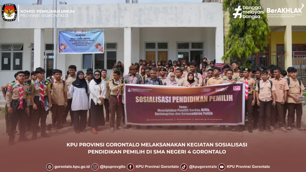 Gorontalo - KPU Provinsi Gorontalo melaksanakan Sosialisasi Pendidikan Pemilih di SMA Negeri 4 Gorontalo. Kegiatan ini diikuti oleh Anggota KPU Provinsi Gorontalo, Opan Hamsah dan Roy Hamrain. Sosialisasi berlangsung di Lapangan SMA Negeri 4 Gorontalo pada Jumat (14/11/2025).