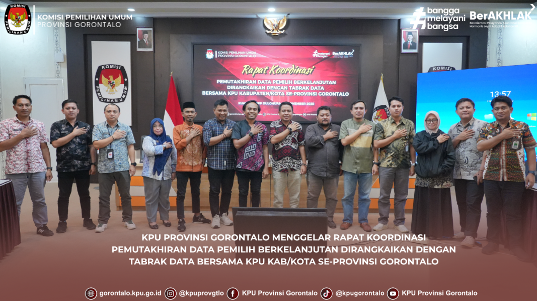 Gorontalo - KPU Provinsi Gorontalo menyelenggarakan Rapat Koordinasi Pemutakhiran Data Pemilih Berkelanjutan yang dirangkaikan dengan kegiatan tabrak data bersama KPU Kabupaten/Kota se-Provinsi Gorontalo. Kegiatan ini diikuti oleh Anggota KPU Provinsi Gorontalo, Roy Hamrain, dan berlangsung di Aula KPU Provinsi Gorontalo pada Jumat (14/11/2025).