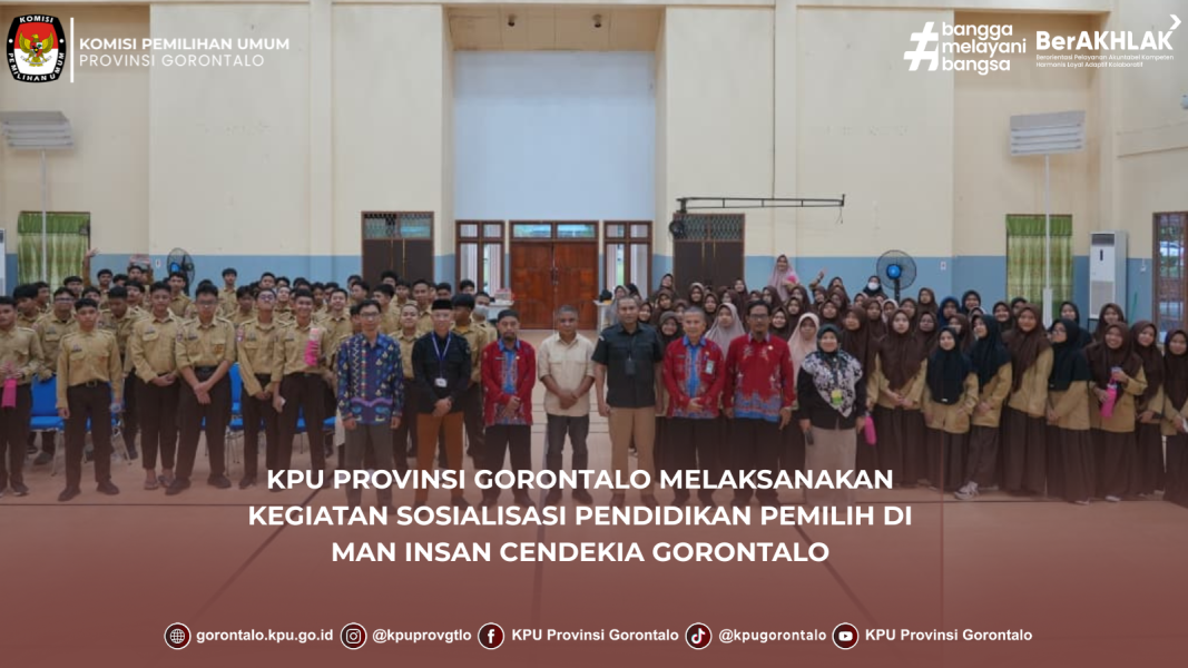 Gorontalo - KPU Provinsi Gorontalo melaksanakan Sosialisasi Pendidikan Pemilih di MAN Insan Cendekia Gorontalo. Kegiatan ini diikuti oleh Anggota KPU Gorontalo, Opan Hamsah, dan berlangsung di Gedung Serba Guna MAN Insan Cendekia Gorontalo pada Rabu (19/11/2025).