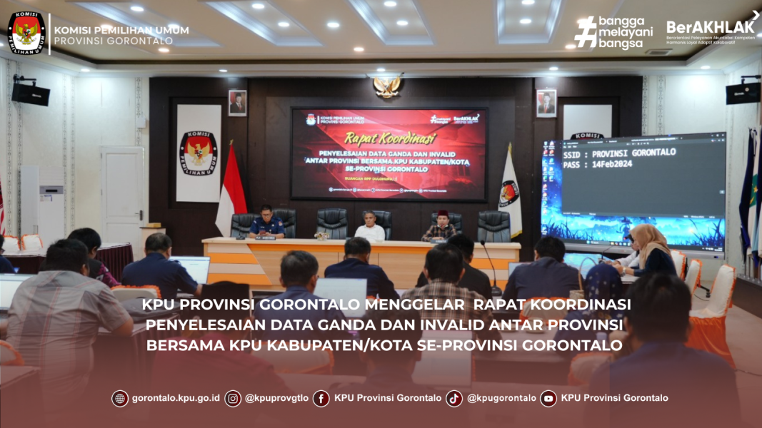 Gorontalo - KPU Provinsi Gorontalo menggelar Rapat Koordinasi Penyelesaian Data Ganda dan Invalid Antar Provinsi bersama KPU Kabupaten/Kota se-Provinsi Gorontalo. Kegiatan ini berlangsung di Aula KPU Provinsi Gorontalo pada Selasa-Rabu (02-03/12/2025).