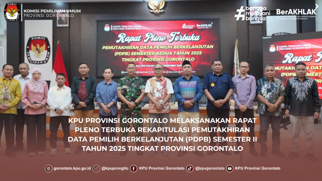 Gorontalo - KPU Provinsi Gorontalo menggelar Rapat Pleno Terbuka Rekapitulasi Pemutakhiran Data Pemilih Berkelanjutan (PDPB) Semester II Tahun 2025 Tingkat Provinsi Gorontalo. Rapat dipimpin oleh Ketua KPU Provinsi Gorontalo, Sophian Rahmola, bersama anggota KPU Provinsi Gorontalo Roy Hamrain, Risan Pakaya, Hendrik Imran dan Opan Hamsah. Rapat ini dihadiri oleh berbagai pihak diantaranya Bawaslu Provinsi Gorontalo, Dukcapil Provinsi Gorontalo, Korem 133 Nani Wartabone, Polda Provinsi Gorontalo, Kanwil Dirjen Pemasyarakatan Provinsi Gorontalo, serta KPU kab/kota se-Provinsi Gorontalo, kegiatan berlangsung di Aula KPU Provinsi Gorontalo pada Kamis (11/12/2025).