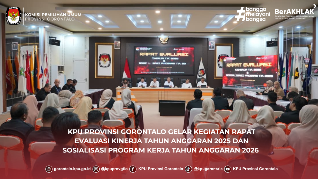 Gorontalo - KPU Provinsi Gorontalo menggelar Rapat Evaluasi Kinerja Tahun Anggaran 2025 sekaligus Sosialisasi Program Kerja Tahun Anggaran 2026 yang berlangsung di Aula KPU Provinsi Gorontalo pada Rabu (31/12/2025).
