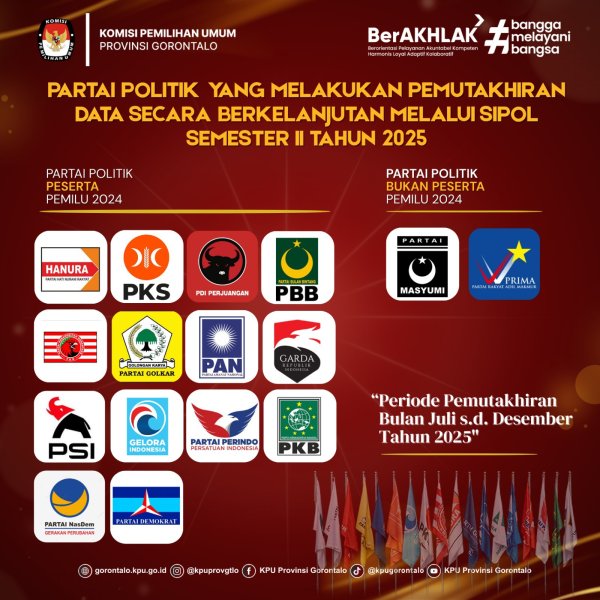 Gorontalo - inilah daftar Partai Politik Tingkat Provinsi Gorontalo yang melakukan Pemutakhiran Data Secara Berkelanjutan melalui SIPOL pada Semester II Tahun 2025: