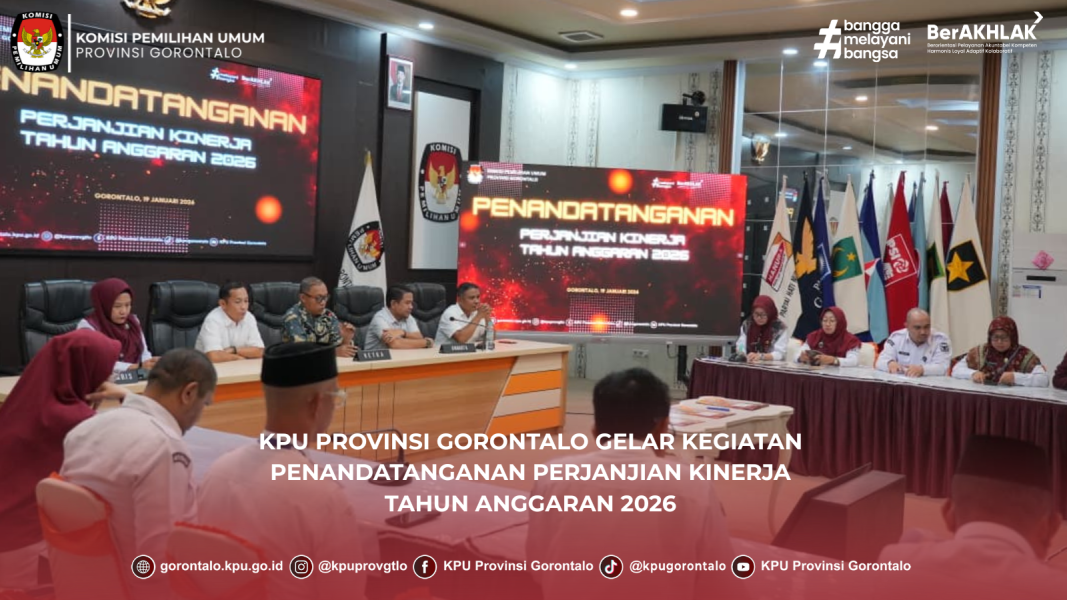 Gorontalo - KPU Provinsi Gorontalo menggelar kegiatan Penandatanganan Perjanjian Kinerja Tahun Anggaran 2026. Kegiatan berlangsung di Aula KPU Provinsi Gorontalo pada Senin (19/01/2026).