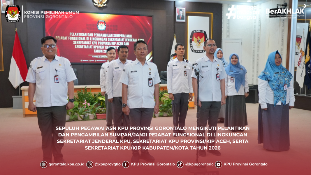 Gorontalo - Sepuluh pegawai ASN KPU Provinsi Gorontalo mengikuti pelantikan serta pengambilan sumpah/janji Pejabat Fungsional Penata Kelola Pemilihan Umum di lingkungan Sekretariat Jenderal KPU, Sekretariat KPU Provinsi/KIP Aceh, dan Sekretariat KPU/KIP Kabupaten/Kota Tahun 2026. Prosesi pelantikan dipimpin oleh Sekretaris Jenderal KPU RI, Bernad Dermawan Sutrisno, serta dihadiri Ketua KPU RI, Mochammad Afifuddin. Kegiatan berlangsung secara daring di ruang Aula KPU Provinsi Gorontalo pada Kamis (22/01/2026).