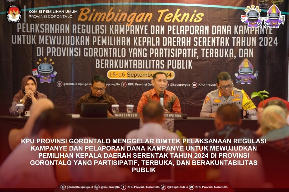 Plt. Ketua KPU Provinsi Gorontalo Risan Pakaya bersama Anggota KPU Provinsi Gorontalo Opan Hamsah dan Hendrik Imran membuka kegiatan Bimbingan Teknis Pelaksanaan Regulasi Kampanye dan Pelaporan Dana Kampanye untuk Mewujudkan Pemilihan Kepala Dareah Serentak Tahun 2024 di Provinsi Gorontalo yang Partisipatif, Terbuka, dan Berakuntabilitas Publik bertempat di Hotel Aston Kota Gorontalo, Minggu (15/09/2024).