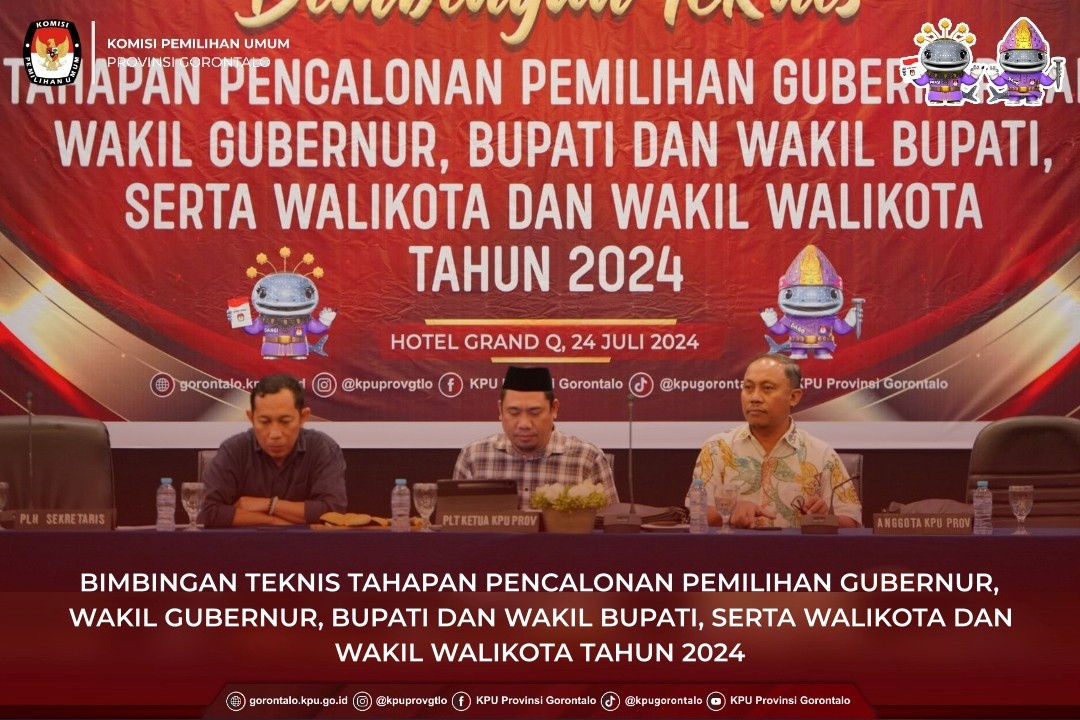 #TemanPemilih, KPU Provinsi Gorontalo menyelenggarakan Bimbingan Teknis Tahapan Pencalonan Pemilihan Gubernur dan Wakil Gubernur, Bupati dan Wakil Bupati, serta Walikota dan Wakil Walikota Tahun 2024 pada Rabu, 24 Juli 2024. Kegiatan ini dilaksanakan secara hybrid, dengan pertemuan luring bertempat di Hotel Grand Q Kota Gorontalo dan daring melalui aplikasi Zoom Meeting.