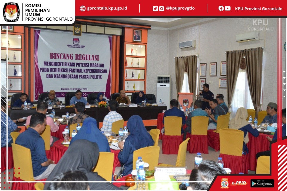 Dihadiri oleh KPU Kabupaten/Kota se-Provinsi Gorontalo, Selasa (13/9) digelar kegiatan Bincang Regulasi "Identifikasi Potensi Masalah pada Verifikasi Faktual Calon Peserta Pemilu" di Aula KPU Kabupaten/Boalemo.