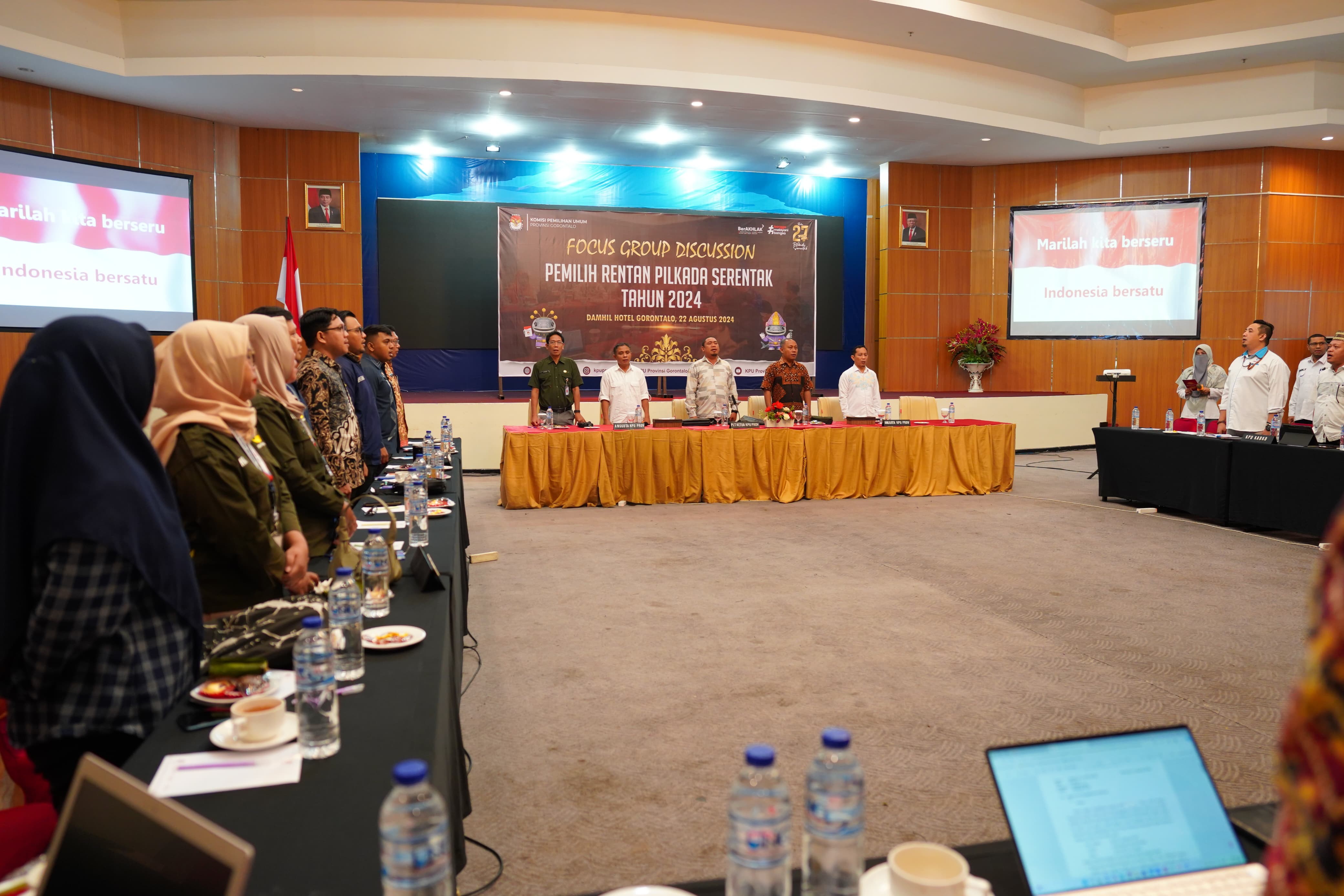 Plt. Ketua kpu provinsi gorontalo Risan Pakaya bersama Anggota KPU Provinis Gorontalo Sophiqn Rahmola, Hendrik Imran, Opan Hamsah beserta Sekretaris KPU Provinsi Gorontalo R. Sutyanto membuka acara Focus Group Discussion Pemilih Rentan Pilkada Serentak Tahun 2024 bertempat di Hotel Damhil Kota Gorontalo, Kamis (22/08/2024)