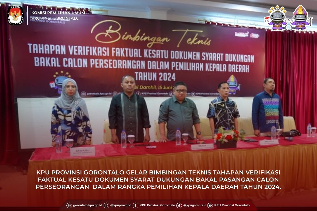 #TemanPemilih, KPU Provinsi Gorontalo menyelenggarakan Bimbingan Teknis (Bimtek) Tahapan Verifikasi Faktual Kesatu Dokumen Syarat Dukungan Bakal Pasangan Calon Perseorangan dalam rangka Pemilihan Kepala Daerah (Pilkada) Tahun 2024. Acara tersebut dilaksanakan di UTC Damhil Universitas Negeri Gorontalo (UNG), Kota Gorontalo.
