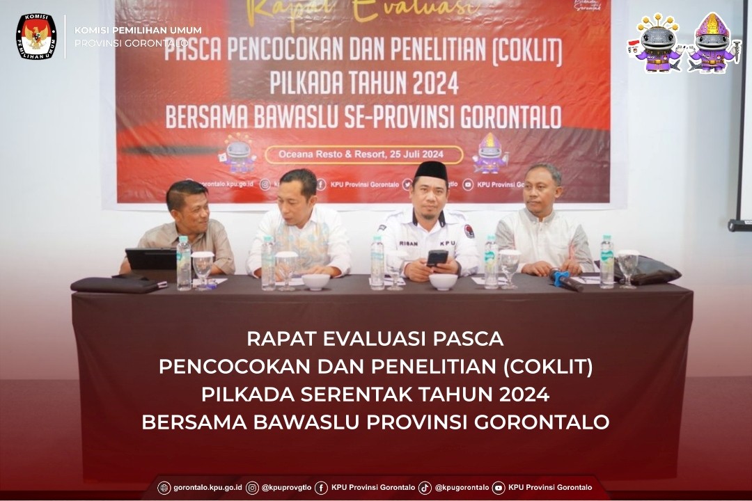 #TemanPemilih, dalam rangka Pemutakhiran Data Pemilih untuk Pemilihan Gubernur dan Wakil Gubernur, Bupati dan Wakil Bupati, serta Walikota dan Wakil Walikota Tahun 2024, KPU Provinsi Gorontalo akan melaksanakan Rapat Evaluasi Pasca Pencocokan dan Penelitian (Coklit) bersama Badan Pengawas Pemilu (Bawaslu) se-Provinsi Gorontalo. Kegiatan ini akan berlangsung pada Kamis, 25 Juli 2024, di Oceana Resto & Resort, Kota Gorontalo.