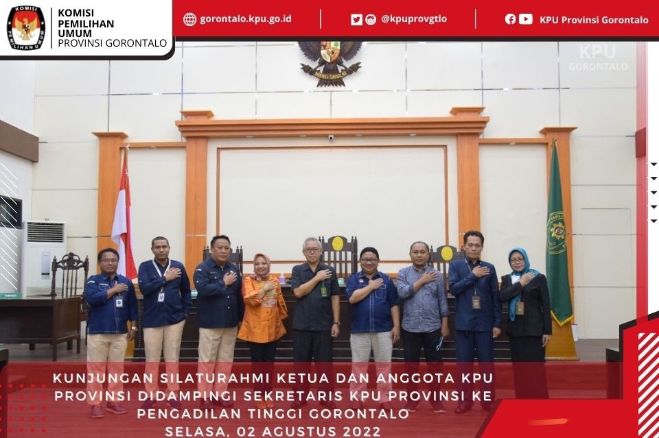 Kunjungan silaturahim Ketua dan anggota KPU Provinsi Gorontalo dalam mensosialisasikan tahapan Pemilu 2024 di kantor Pengadilan Tinggi (PT) Gorontalo (02/08/22).