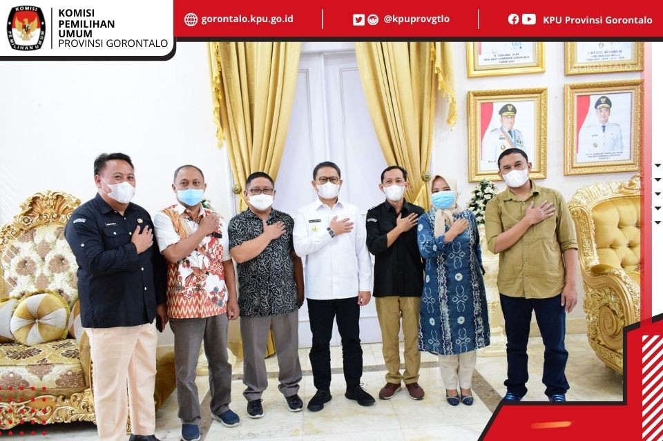 Ketua dan Anggota KPU Provinsi beserta Sekretaris KPU Provinsi dan pejabat terkait melakukan kunjungan sekaligus silaturahmi perdana bersama Penjabat Gubernur Gorontalo Hamka Hendra Noer di Rumah Jabatan Gubernur (18/05/22).