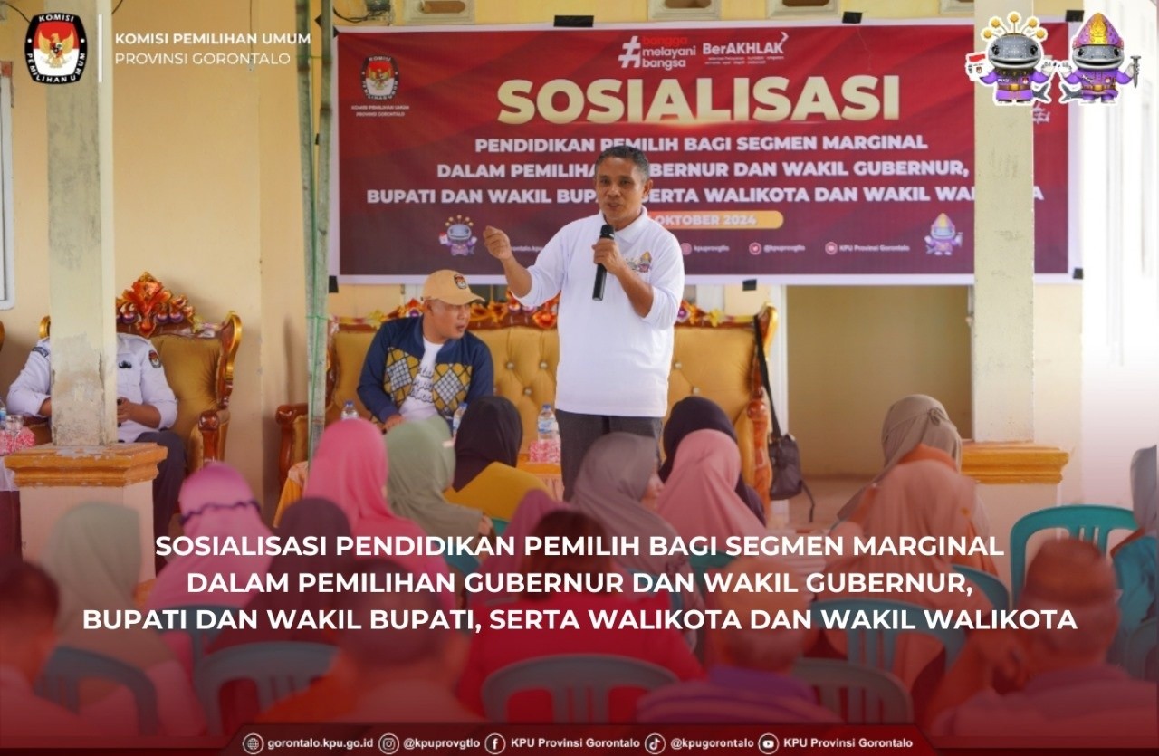 Dalam rangka meningkatkan partisipasi pemilih pada Pilkada 2024, KPU Provinsi Gorontalo melaksanakan kegiatan sosialisasi pendidikan pemilih yang menyasar masyarakat di daerah kurang terjangkau. Kegiatan ini berlangsung di tiga lokasi: Desa Pangea dan Desa Rejonegoro di Kabupaten Boalemo, serta Kelurahan Limba B di Kota Gorontalo, pada tanggal 17 hingga 18 Oktober 2024.