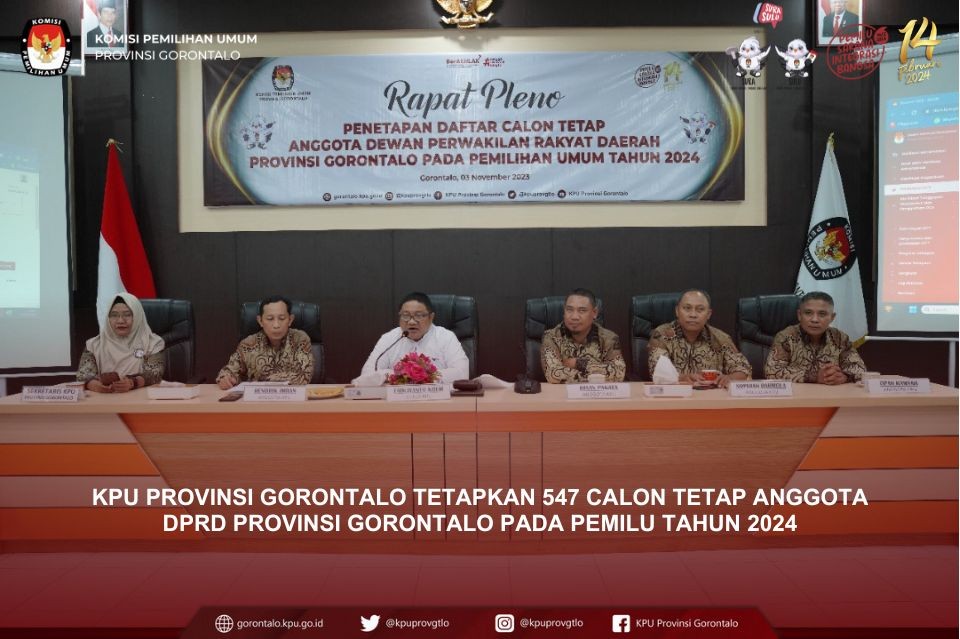 hari ini Jum'at (03/11/2023) KPU Provinsi Gorontalo melaksanakan Rapat Pleno Penetapan Daftar Calon Tetap (DCT) Anggota DPRD Provinsi Gorontalo dalam Pemilu 2024.
