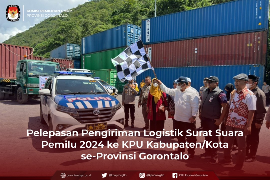 KPU Provinsi Gorontalo melepas pengiriman logistik surat suara Pemilu 2024, Jumat (22/12/2023). Pelepasan dilakukan oleh Ketua KPU Provinsi Gorontalo, Fadliyanto Koem, di Depo Kontainer Pelabuhan Gorontalo. Turut hadir Anggota KPU Provinsi Gorontalo Opan Hamsah dan Sophian Rahmola, serta Ketua Bawaslu Provinsi Gorontalo, Idris Usuli, Karo Ops dan Kabag Bin Ops Polda Gorontalo.