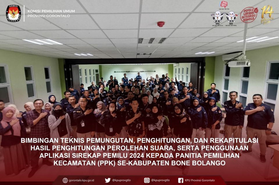 KPU Provinsi Gorontalo menggelar Bimbingan Teknis Pemungutan, Penghitungan, dan Rekapitulasi Hasil Penghitungan Perolehan Suara serta Penggunaan Aplikasi SIREKAP Pemilihan Umum Tahun 2024 kepada Panitia Pemilihan Kecamatan (PPK) se-Kabupaten Bone Bolango, bertempat di Aula Fakultas Teknik Kampus 4 Universitas Negeri Gorontalo, Minggu (17/12/2023).