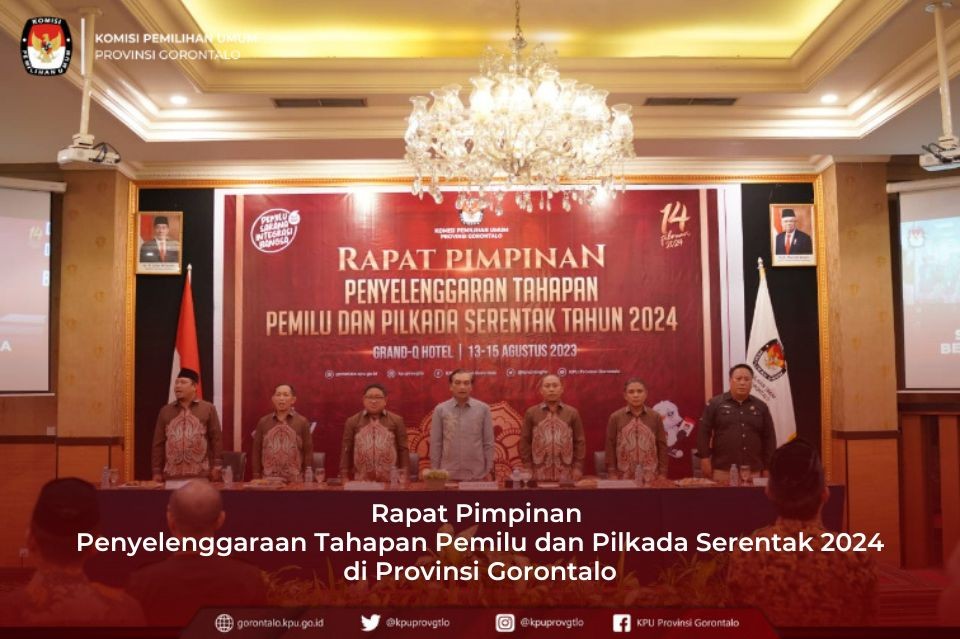KPU Provinsi Gorontalo menggelar Rapat Pimpinan Penyelenggaraan Tahapan Pemilu dan Pilkada Serentak Tahun 2024, Minggu (13/08/2023) di Grand Q Hotel Kota Gorontalo.