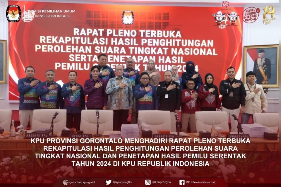 Ketua KPU Provinsi Gorontalo, Fadliyanto Koem, Anggota KPU Provinsi Gorontalo, Opan Hamsah, Sophian Rahmola, Hendrik Imran, dan Risan Pakaya, didampingi Sekretaris KPU Provinsi Gorontalo, Mukti Abdullatif Mile dan jajaran Sekretariat KPU Provinsi Gorontalo, menghadiri Rapat Pleno Terbuka Rekapitulasi Hasil Penghitungan Perolehan Suara Tingkat Nasional serta Penetapan Hasil Pemilu Serentak Tahun 2024 yang diselenggarakan oleh KPU Republik Indonesia di Jakarta, Sabtu (9/03/2024) pukul 13.00 WIB.