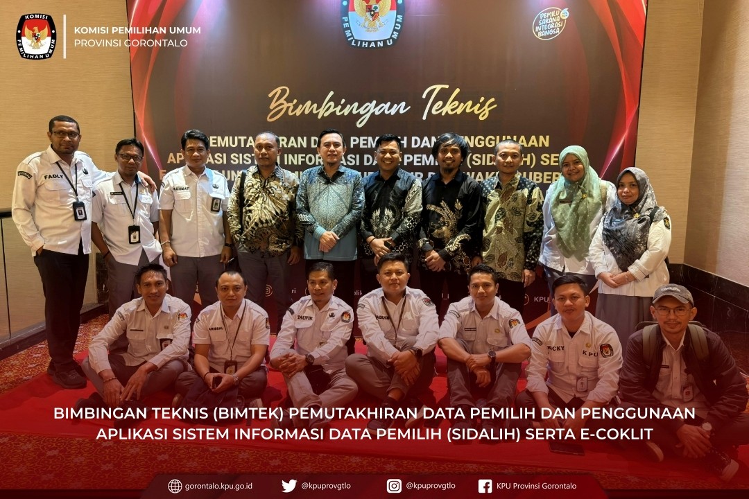 #TemanPemilih, KPU Provinsi Gorontalo mengikuti Bimbingan Teknis (Bimtek) Pemutakhiran Data Pemilih dan Penggunaan Aplikasi Sistem Informasi Data Pemilih (SIDALIH) serta E-Coklit. Kegiatan ini merupakan bagian dari persiapan pelaksanaan Pemilihan Gubernur dan Wakil Gubernur, Bupati dan Wakil Bupati, serta Walikota dan Wakil Walikota tahun 2024.