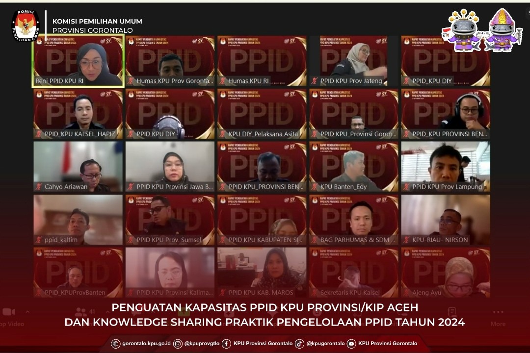 KPU Provinsi Gorontalo mengikuti Rapat Penguatan Kapasitas Pejabat Pengelola Informasi dan Dokumentasi (PPID) KPU Provinsi Tahun 2024, yang diselenggarakan oleh KPU Republik Indonesia secara luring pada Rabu (2/10/2024).