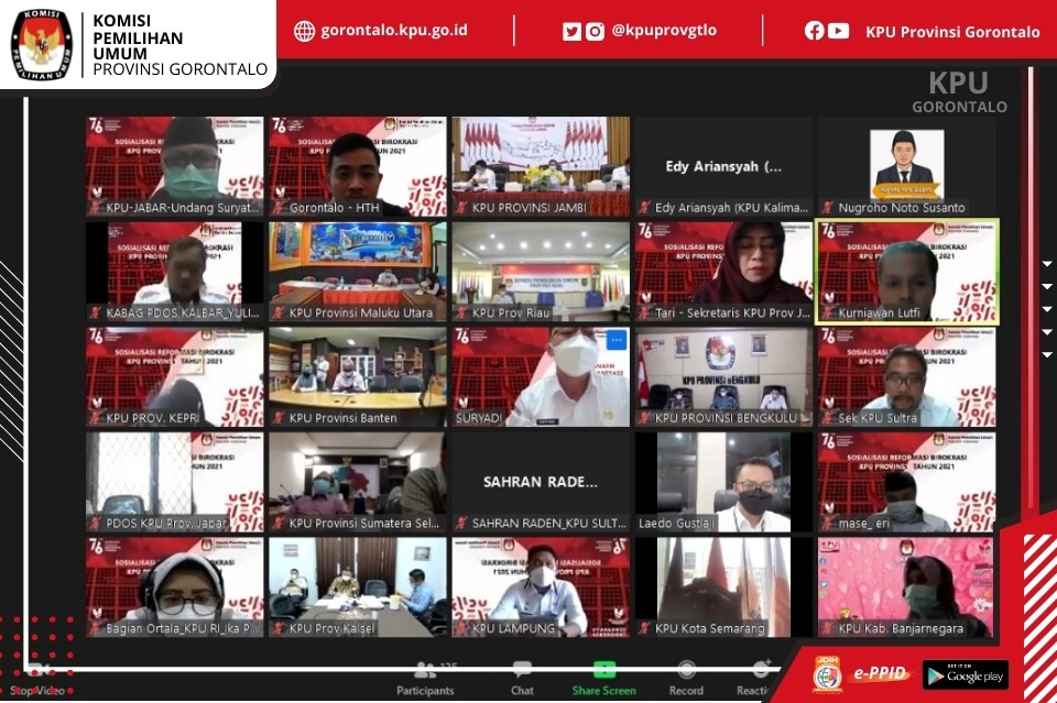 Hari ini Kamis (26/08/2021), KPU Provinsi Gorontalo mengikuti Sosialisasi Reformasi Birokrasi kepada 24 KPU Provinsi yang diselenggarakan oleh KPU Republik Indonesia secara virtual.