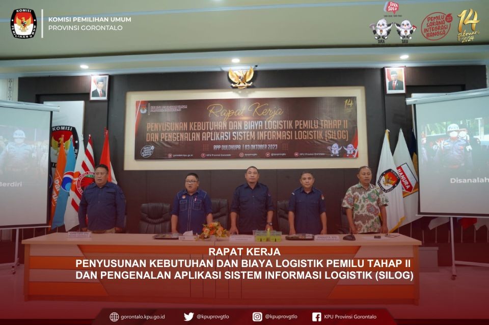 KPU Provinsi Gorontalo menyelenggarakan Rapat Kerja Penyusunan Kebutuhan dan Biaya Logistik Pemilu Tahap II dan Pengenalan Aplikasi Sistem Informasi Logistik (Silog), Selasa (03/10/2023).