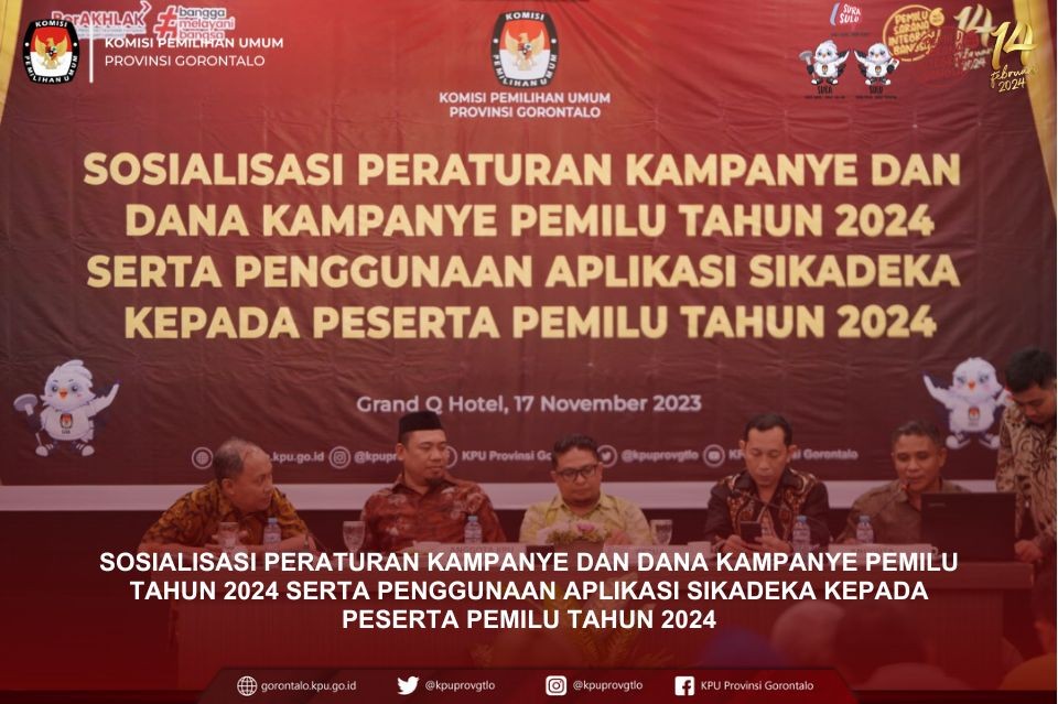 KPU Provinsi Gorontalo menyelenggarakan Sosialisasi Peraturan Kampanye dan Dana Kampanye Pemilu Tahun 2024 serta Penggunaan Aplikasi Sikadeka kepada Peserta Pemilu Tahun 2024 bertempat di Grand Q Hotel Kota Gorontalo, Jum’at (17/11/2023).