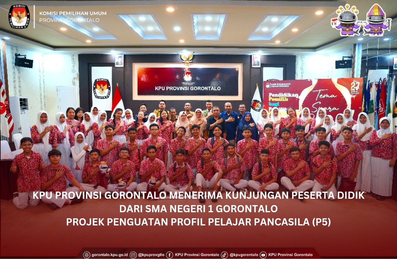 Ketua KPU Provinsi Gorontalo Sophian Rahmola bersama Anggota KPU Provinsi Gorontalo Opan Hamsah, Hendrik Imran, Roy Hamrain, Menerima Kunjungan Lapangan Peserta Didik Dari SMA Negeri 1 Gorontalo Projek Penguatan Profil Pelajar Pancasila (P5) bertempat di Aula RPP Dulohupa KPU Provinsi Gorontalo, Selasa (8/10/2024).
