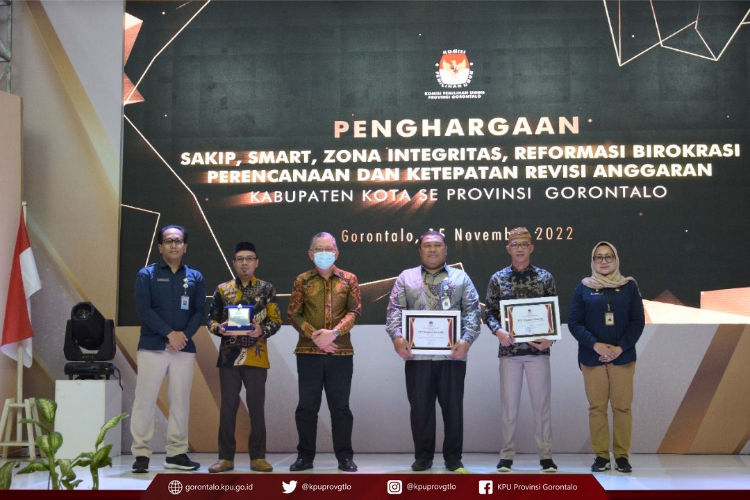 Komisi Pemilihan Umum Provinsi Gorontalo memberikan penghargaan SAKIP, SMART, Zona Integritas, Reformasi Birokrasi, Perencanaan dan Ketepatan Revisi Anggaran kepada KPU Kabupaten dan Kota se Provinsi Gorontalo di Hotel Aston (16/11/22)