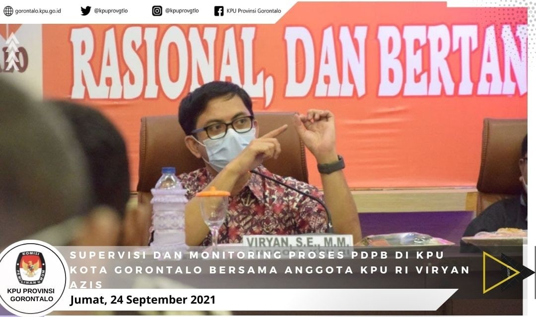 Mengawali kunjungan kerjanya di Provinsi Gorontalo, Anggota KPU RI Viryan Azis menyambangi KPU Kota Gorontalo untuk melaksanakan supervisi dan monitoring proses pelaksanaan PDPB di Kota Gorontalo yang menjadi salah satu daerah pilot Project PDPB se indonesia (24/09/21).