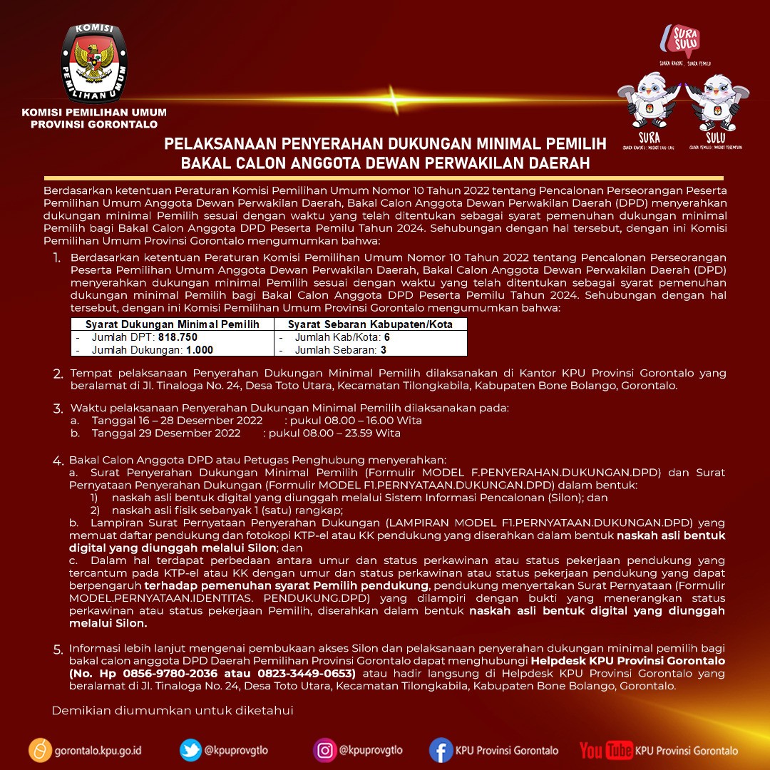 PENGUMUMAN NOMOR 1397/PL.01.4-Pu/75/2022 TENTANG PELAKSANAAN PENYERAHAN DUKUNGAN MINIMAL PEMILIH BAKAL CALON ANGGOTA DEWAN PERWAKILAN DAERAH