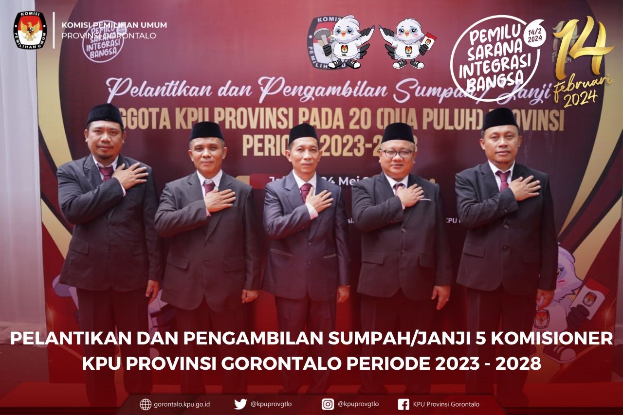 5 anggota KPU Provinsi Gorontalo periode 2023-2028 yakni Fadliyanto Koem, Hendrik Imran, Opan Hamsah, Risan Pakaya dan Sophian M. Rahmola dilantik dan diambil sumpah/janjinya pada hari ini Rabu 24 Mei 2023.