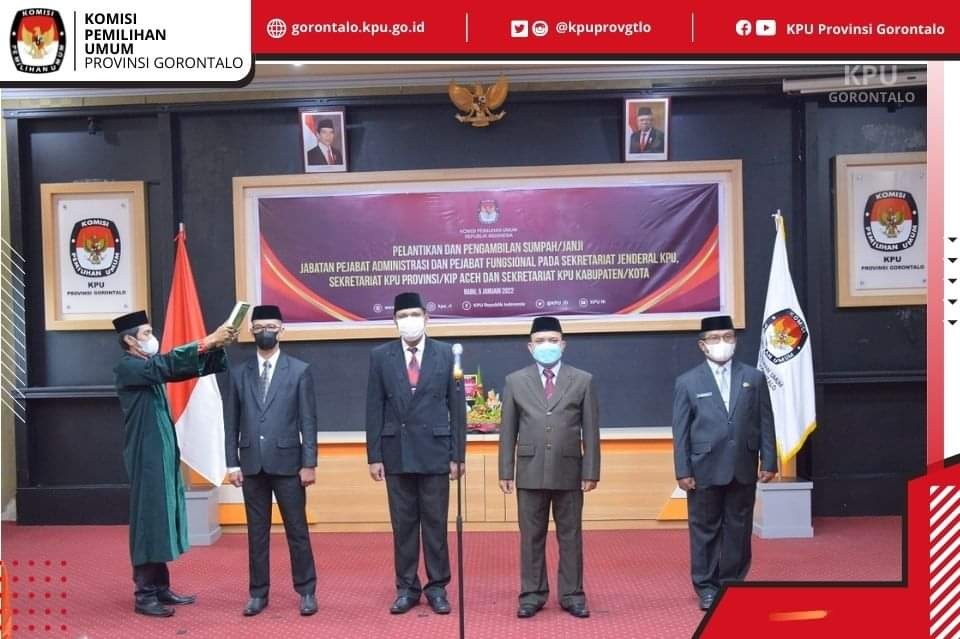 Bertempat di RPP Dulohupa KPU Provinsi 3 Pejabat Administrator dari KPU Provinsi Gorontalo dan 1 Pejabat Administrator KPU Kabupaten Pohuwato dilantik dan diambil sumpah/ janji oleh Sekretaris Jendral KPU RI Bernard Dermawan Sutrisno secara daring. (05/01/22)