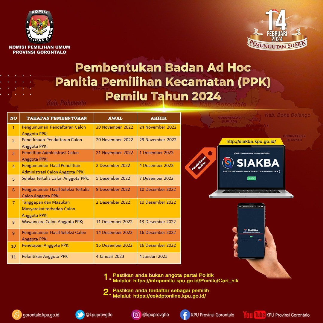 Untuk pendaftaran Panitia Pemilihan Kecamatan (PPK) di 6 (enam) Kabupaten/Kota se-Provinsi Gorontalo bisa klik tautan di bawah ini: