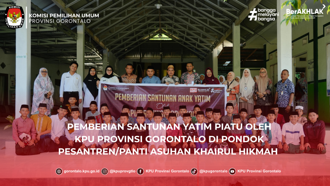 Kegiatan dihadiri oleh Anggota KPU Provinsi Gorontalo, Roy Hamrain, serta Plt. Sekretaris KPU Provinsi Gorontalo, Marleni Makuta, bersama jajaran sekretariat. Santunan diberikan kepada Pondok Pesantren/Panti asuhan Khairul Hikmah, kehadiran KPU Provinsi Gorontalo disambut hangat oleh jajaran guru dan anak-anak Pondok Pesantren/Panti asuhan Khairul Hikmah.