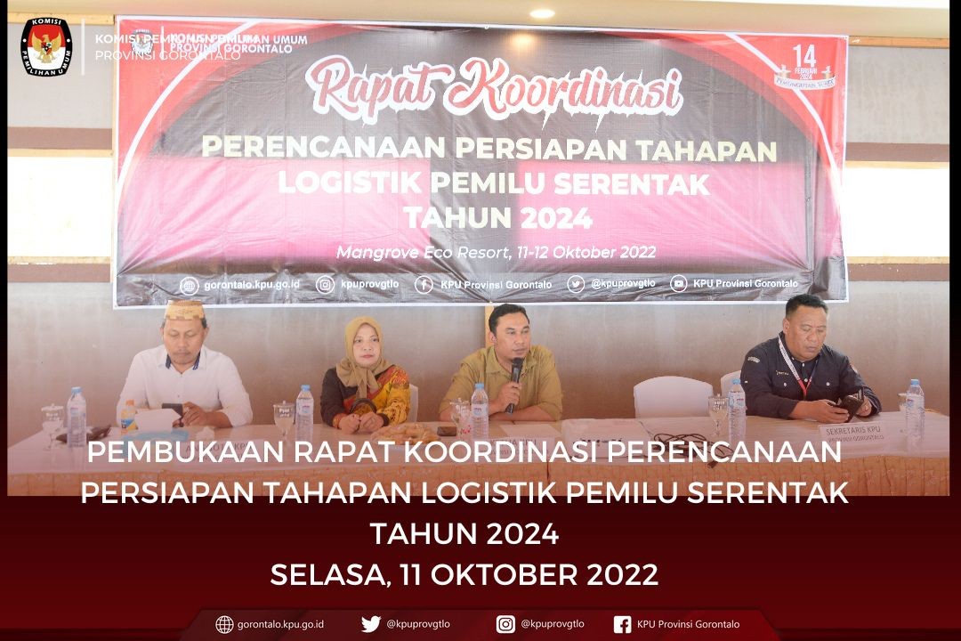 Anggota KPU Provinsi divisi Hukum dan Pengawasan Ramli Ondang Djau membuka kegiatan Rapat koordinasi perencanaan persiapan tahapan logistik pemilu serentak tahun 2024 di Mangrove Eco Resort Kabupaten Pohuwato (11/10/22)