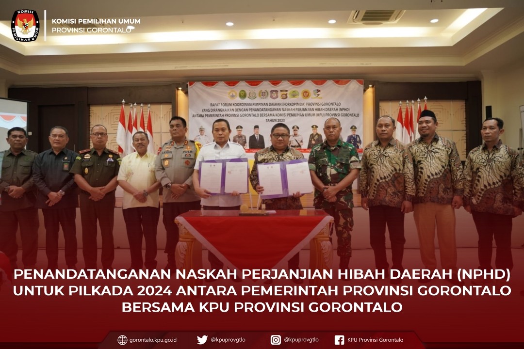 Pemerintah Provinsi Gorontalo bersama Komisi Pemilihan Umum (KPU) menandatangani Naskah Perjanjian Hibah Daerah (NPHD) untuk pembiayaan Pemilu dan Pemilihan Kepala Daerah tahun 2024. NPHD ditandatangani oleh Penjabat Gubernur Gorontalo, Ismail Pakaya, bersama Ketua KPU Provinsi Gorontalo, Fadliyanto Koem, pada rapat Forum Koordinasi Pimpinan Daerah di aula rumah jabatan gubernur, Selasa (24/10/2023).