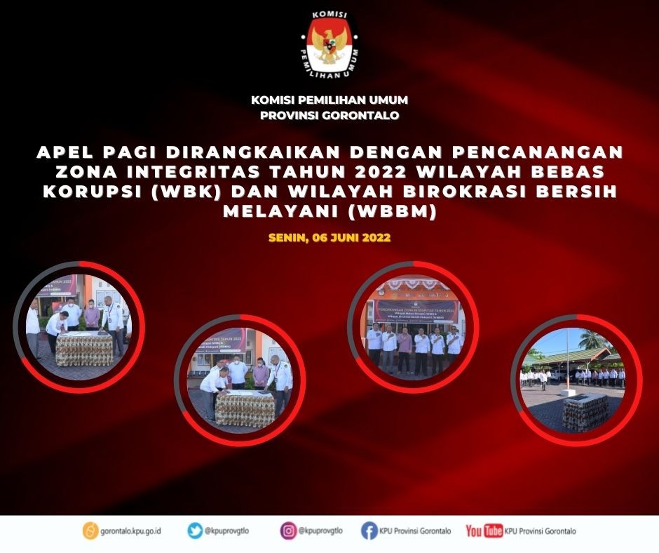 Komisi Pemilihan Umum Provinsi Gorontalo menggelar kegiatan apel pagi yang dirangkaikan dengan Pencanangan Zona Integritas Tahun 2022 Wilayah Bebas Korupsi (WBK) dan Wilayah Birokrasi Bersih Melayani (WBBM). Senin (06/06/2022)