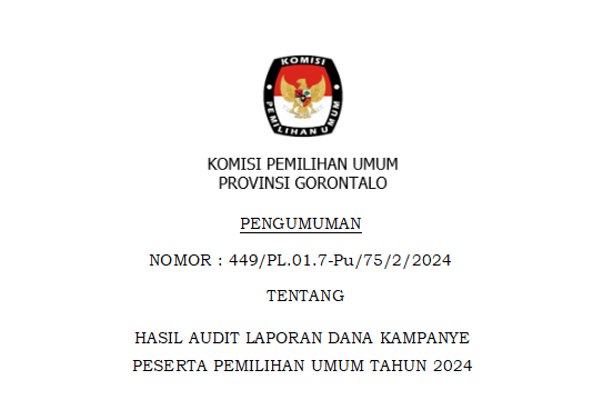 #TemanPemilih, berikut Pengumuman Hasil Audit Laporan Dana Kampanye Peserta Pemilihan Umum Tahun 2024 untuk Partai Politik dan Calon Anggota DPD RI Daerah Pemilihan Provinsi Gorontalo.