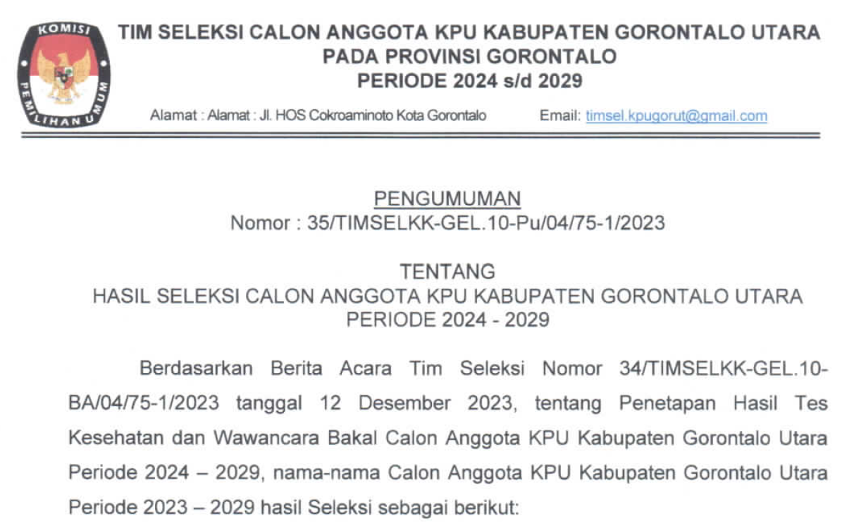 Pengumuman Nomor 35/TIMSELKK-GEL.10-Pu/04/75-1/2023 tentang Hasil Seleksi Calon Anggota KPU Kabupaten Gorontalo Utara Periode 2024-2029