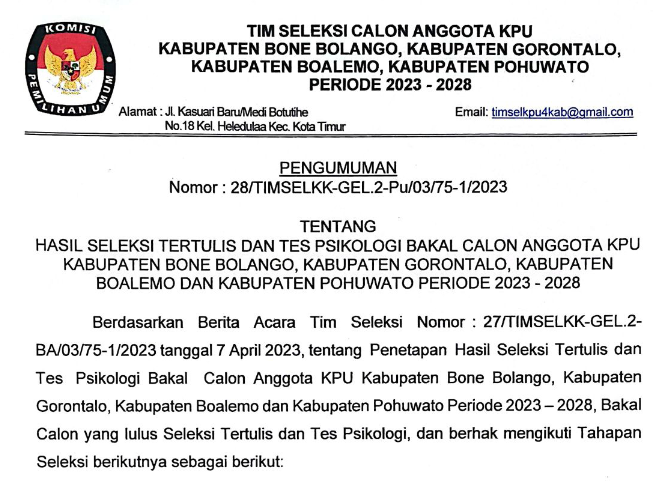 Pengumuman Nomor 28/TIMSELKK-GEL.2-Pu/03/75-1/2023 tentang Hasil Seleksi Tertulis dan Tes Psikologi Bakal Calon Anggota KPU Kabupaten Bone Bolango, Kabupaten Gorontalo, Kabupaten Boalemo dan Kabupaten Pohuwato Periode 2023-2028.