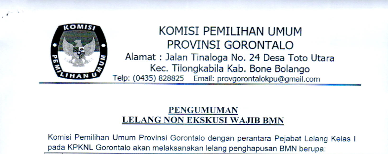 Komisi Pemilihan Umum Provinsi Gorontalo dengan perantara Pejabat Lelang Kelas I pada KPKNL Gorontalo akan melaksanakan lelang penghapusan BMN berupa: