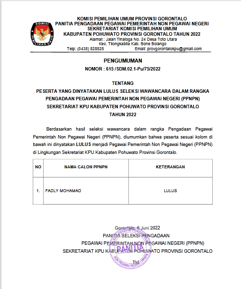 Pengumuman Lulus Seleksi Wawancara dalam rangka Pengadaan Pegawai Pemerintah Non Pegawai Negeri (PPNPN) Sekretariat KPU Kabupaten Pohuwato Provinsi Gorontalo Tahun 2022