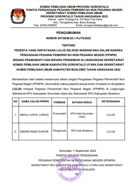 PENGUMUMAN PESERTA YANG DINYATAKAN LULUS SELEKSI WAWANCARA DALAM RANGKA PENGADAAN PEGAWAI PEMERINTAH NON PEGAWAI NEGERI (PPNPN) BIDANG PRAMUBAKTI DAN BIDANG PENGEMUDI DI LINGKUNGAN SEKRETARIAT KOMISI PEMILIHAN UMUM KABUPATEN GORONTALO UTARA DAN SEKRETARIAT KOMISI PEMILIHAN UMUM KABUPATEN BOALEMO TAHUN ANGGARAN 2022